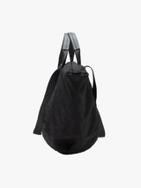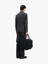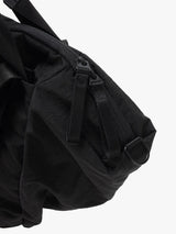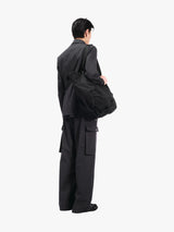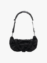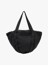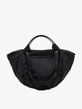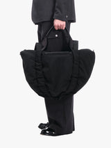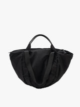 The MINHO weekender bag features gathered ruffle details that can be tailored to shape and expand the bag according to the user's needs. A longer strap offers the option to wear it comfortably on the shoulder, while shorter leather handles add a premium finish.