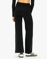 Luxe legwear: a perfect high-rise pant in a dressy wide-rib knit. She has a mid-width leg, banded waist and pretty lettuce-edge trim.