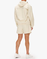 Relaxed fit anorak crafted from luxuriously weighted nylon twill fabric. Reflective piping. Fullzip closure. Mesh lining with welt pockets at the side waist and an interior pocket. Adjustable cinch closure at the hood. Elasticated waist and cuffs.
