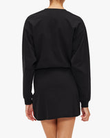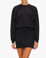 ACTIVE DRESS, BINDING AT SIDE SEAMS AND BOTTOM SKIRT. BLOUSON BODICE, RIBBED NECKLINE AND CUFFS. CB SEAM
