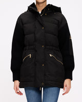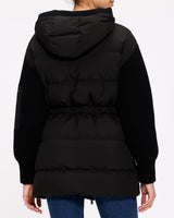 Down pea coat made of a comfortable, silky-looking technical fabric bonded with a waterproof inner membrane and, for the sleeves and on the edge of the large, wrap- around detachable hood, with an extra-fine wool rib knit. Quilted with large boudins, it is padded with soft goose down and fastened at the front with a bright double- slider zipper and concealed snap buttons on the placket. It is complemented by the ‘bomber-style’ fabric pocket on the left sleeve with a zipper, also featured on the shaped pockets, while the inner drawstring accentuates the waist.