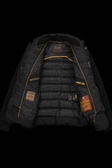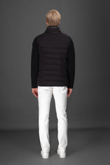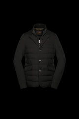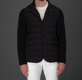 Elegant three-buttons water-resistant blazer made with a mix of wool knit and stretch goose down quilting. The special lined ribbed wool knit sleeves and the internal knit inserts close to the collar are the elements making this garment special for its genre. The precious vest made with shiny fabric, internal wide pockets, and metal zipper is detachable, making this blazer extremely functional. Fabric composition: Tessuto bielastico resinato idrorepellente (88%PA 12%PU), abbinato a parti in maglia misto cachemire (90%WO 10%WS).