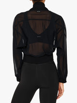 Dress up your athleisure with a layer of sheer power. Cropped full mesh zip-up jacket, elevated with a plunging neckline and voluminous raglan sleeves.