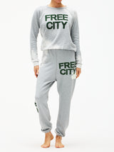 Unisex BLEACHOUT sweatpant in heatheryumm with custom partial hand-bleach process (highs and lows) classic black “FREECITYLARGE” print with cream "FREECITYDOVE," covered elastic waist with pull drawstring.