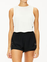 Lightweight mid-crop training tank designed with a curved hem. Made from AeroSilver®, ASRV's next generation of silver-infused performance fabric, it offers enhanced durability and fiber strength to withstand intense training sessions. The tank features side splits with reinforced tack seams for added flexibility, while reflective logo details provide increased visibility during low-light workouts.