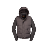 Hybrid bomber jacket in fine pure cashmere flannel with detachable knit sleeves. Quilted boudin padded with goose down. The garment becomes a vest thanks to the detachable wool cashmere blend sleeves. Double front closure consists of coarse-grained metal zipper and buttonhole placket with horn buttons. Removable adjustable hood. Flap pockets on hips, fastened with horn buttons. Convenient inside valuables pockets.