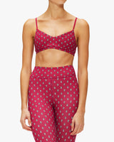 - Minimum coverage bra with adjustable elastic straps - Soft recycled ribbed fabrication printed in The Upside's Rasperry Paisley print - Embroidered arrow logo at back
