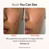 On clean, dry skin, place the Bye Acne device over the breakout and turn on. Hold in place until the 3-minute treatment ends automatically.