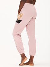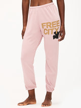 Unisex FLOW sweatpant in ballerina golden with classic "FREECITY" print in golden and black "FREECITYDOVE," covered elastic waist and pull drawcord.