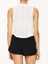 Lightweight mid-crop training tank designed with a curved hem. Made from AeroSilver®, ASRV's next generation of silver-infused performance fabric, it offers enhanced durability and fiber strength to withstand intense training sessions. The tank features side splits with reinforced tack seams for added flexibility, while reflective logo details provide increased visibility during low-light workouts.