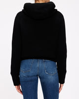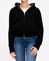 Knitted hooded bomber jacket with a sporty silhouette made from a soft rib knit cashmere blend yarn with a boudin-quilted down-lined interior. Regular fit and front double-slider metal zipper fastening. Side pockets with a finished ribbed edge and interior with a logo trim.